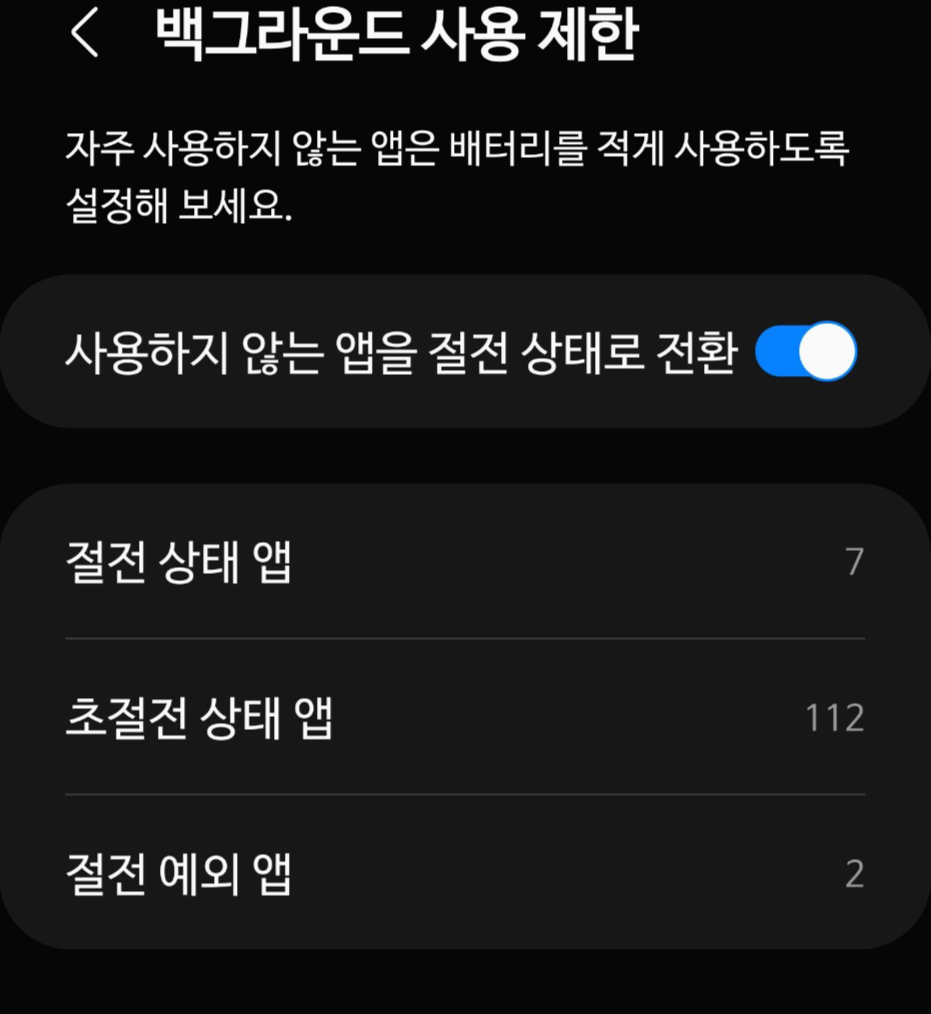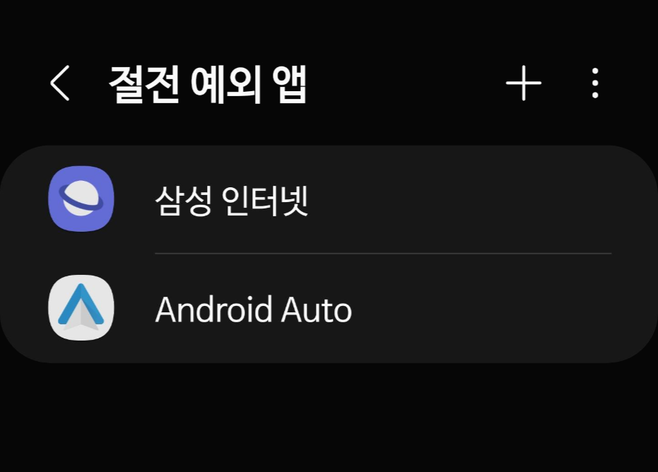 주로 유투브, 유튜브 뮤직, 지니뮤직, 안드로이드 오토 등이 화면이 켜져 있을 때는 실행이 되다가 화면이 꺼지는 경우 배터리 사용량을 줄이기 위해 절전모드로 진입을 하면서 백그라운드 실행 어플이 멈추는 경우가 생기므로 백그라운드 실행 시에도 멈춤 없이 사용하기 위해 절전 예외 앱으로 설정을 하고 사용을 하면 중간에 멈추거나 하는 불편함을 줄일 수 있습니다.