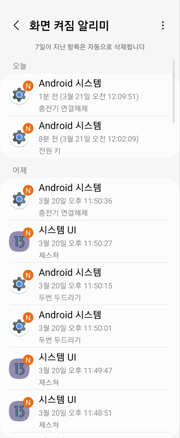 아래와 같이 1분 전 전원 키, 충전기 연결해제 등에 의해서 화면 켜짐의 원인을 확인할 수 있습니다.