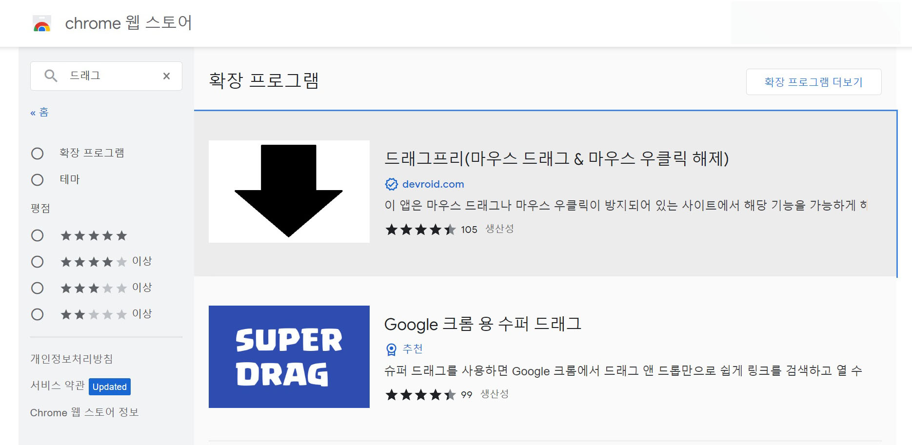 3. chrome웹스토어가 실행이 되면 스토어 검색에서 '드래그프리'확장 프로그램을 검색해주세요