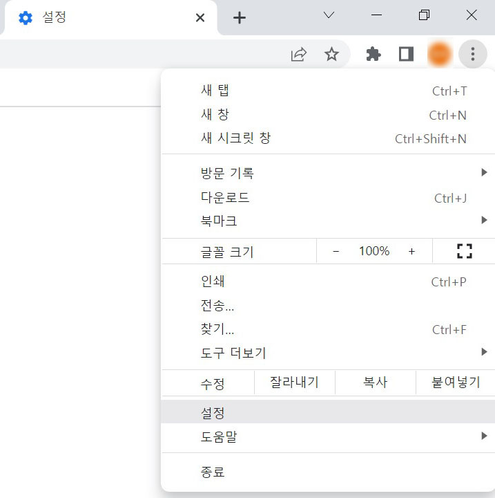1. 우측 상단 크롬 맞춤 설정 및 제어 버튼을 클릭해주세요. 다음 설정을 클릭해주세요